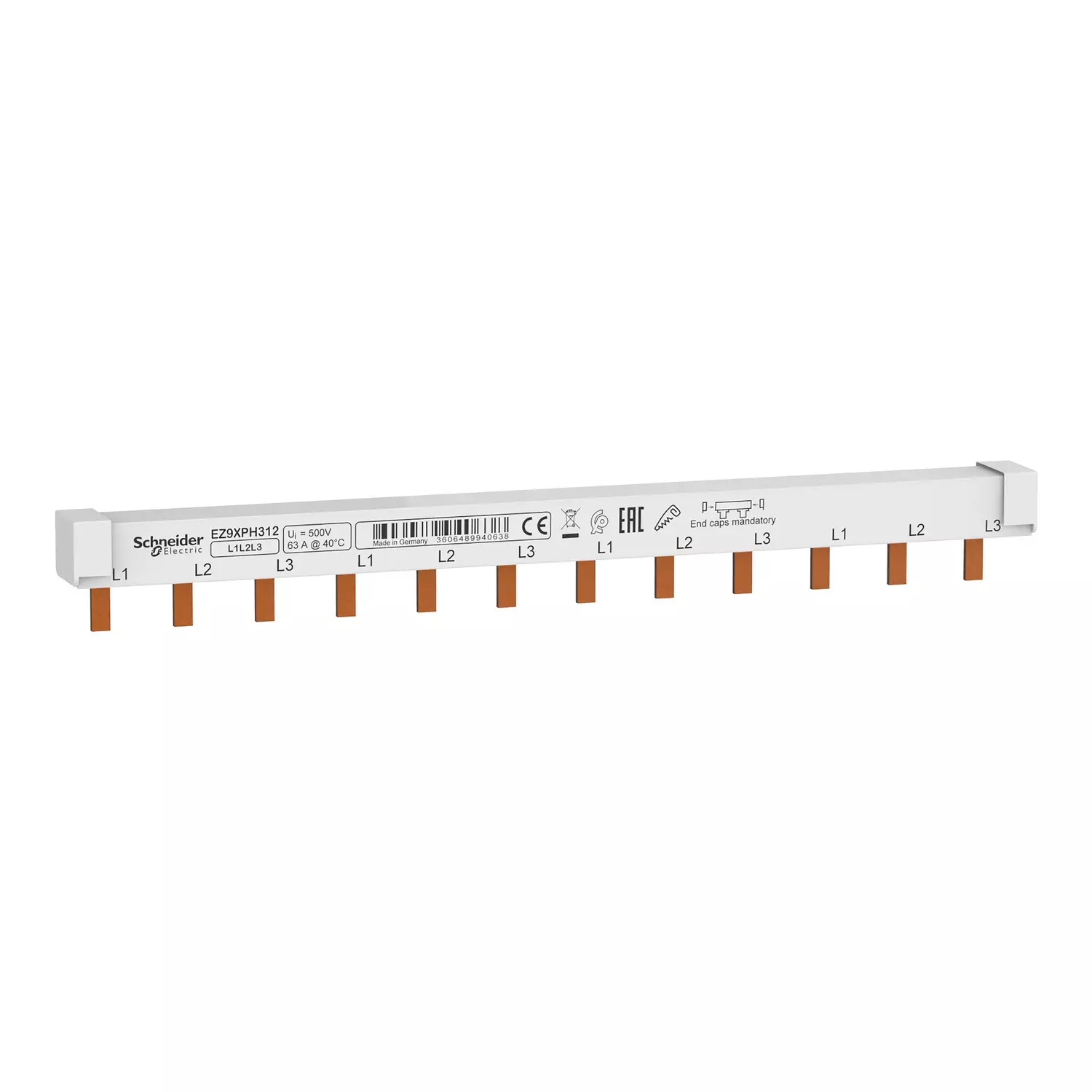 Easy9 vaakasuora virtakisko 12 moduulia. Se on tarkoitettu 3-vaiheisille kojeille Se sopii 4 laitteelle (3-vaihe). Tämä virtakisko on yhteensopiva Easy9 MCB-, RCCB-, RCBO- ja kytkintuotteiden kanssa. 18 mm moduulien kokonaismäärä on 12. Käyttöjännite on 230 V AC (vaiheesta nollaan) ja 400 V AC (vaiheesta vaiheeseen). Eristysjännitteen Ui-arvo on 500 VAC. Toimintataajuus on 50 Hz. Leveys on 2 9 mm:n välein. Väri on vaaleanharmaa (RAL7035). Suojausaste on IP20. Saastumisaste on 3. IEC 60695-2-1 -standardin mukaan palonkestävyys sammuu 850 °C:ssa 30 sekunnin kuluessa.