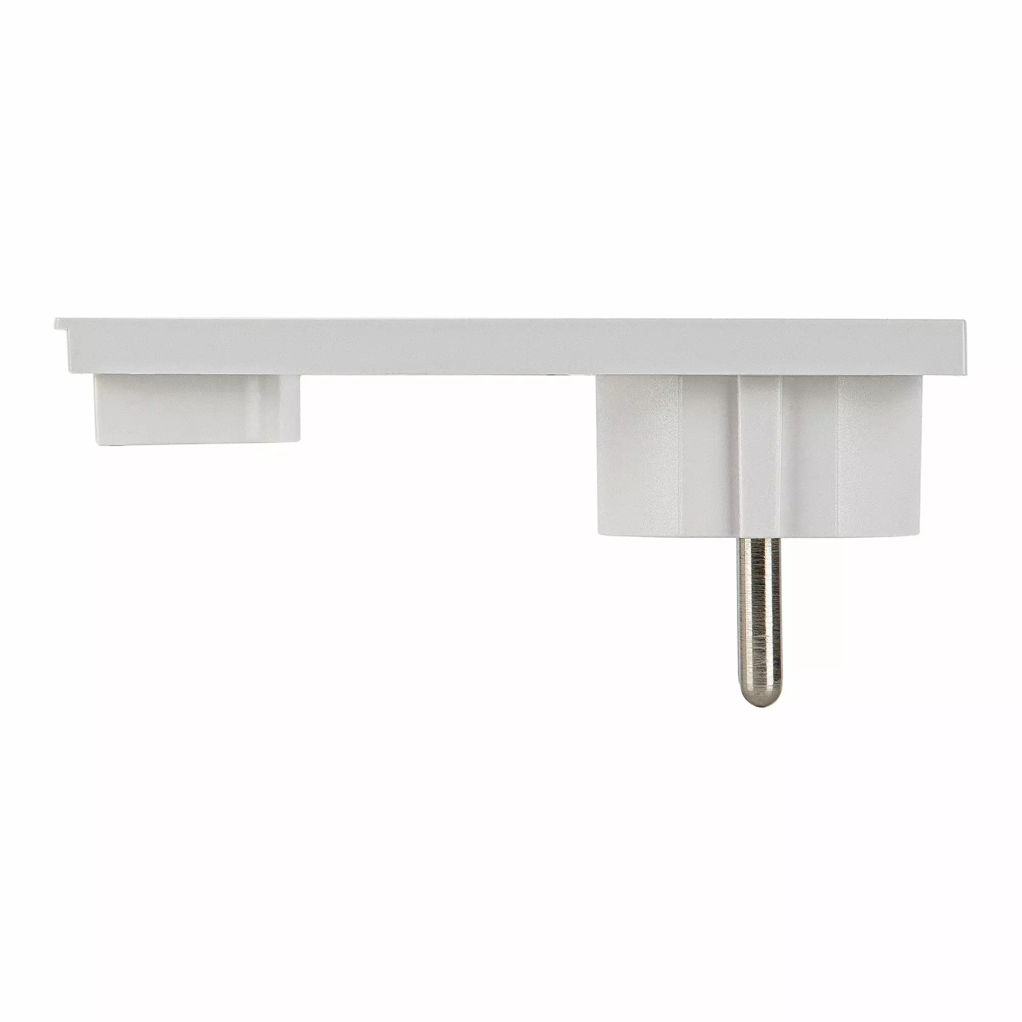 Ultraohut CLOCK-pistoke, jossa on minimaalinen paksuus ja satiiniviimeistely. Väri Valkoinen.
