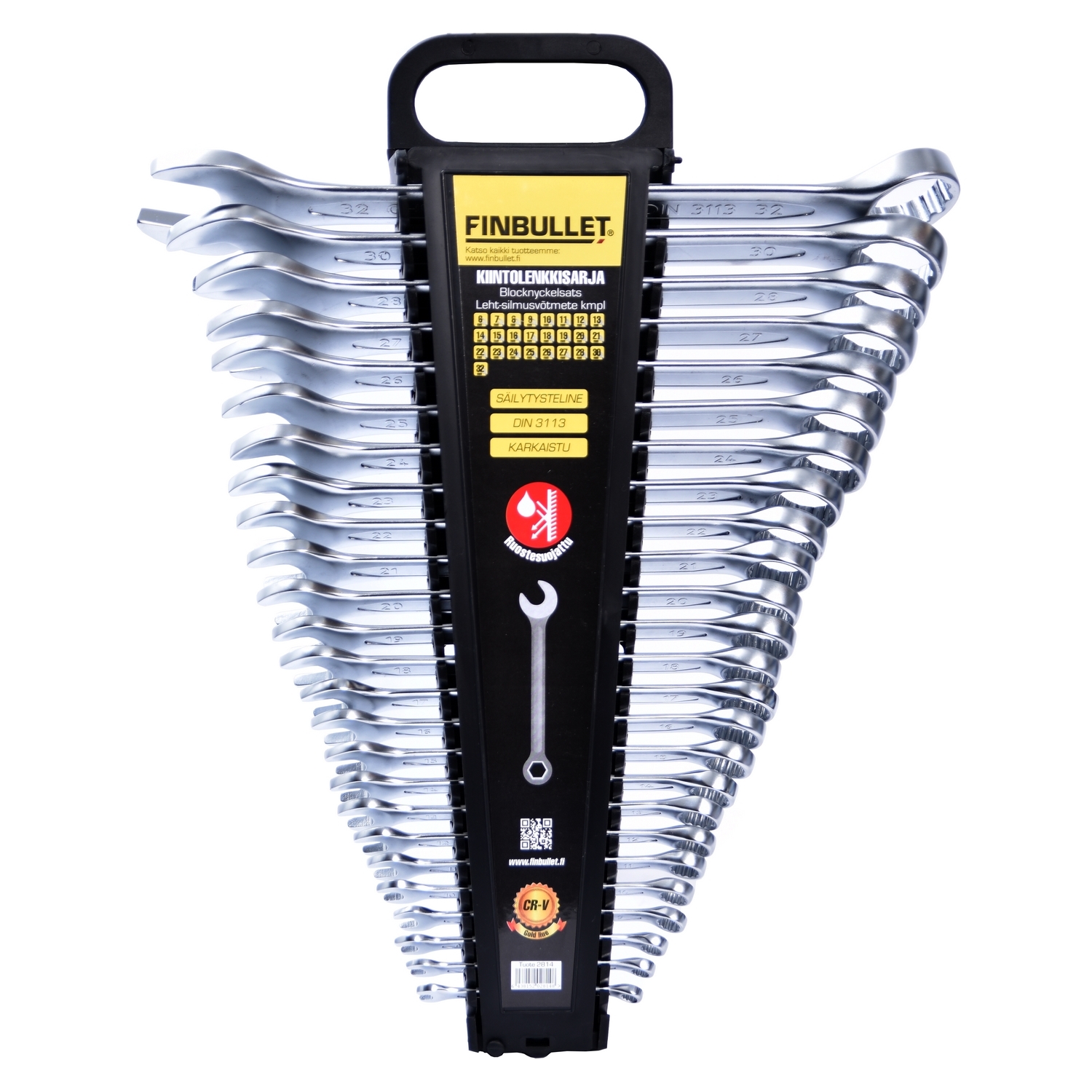 Finbullet kiintolenkkiavainsarjassa on 25 avainta mattapintaiseksi viimeisteltynä. Mukana kätevä säilytysteline.