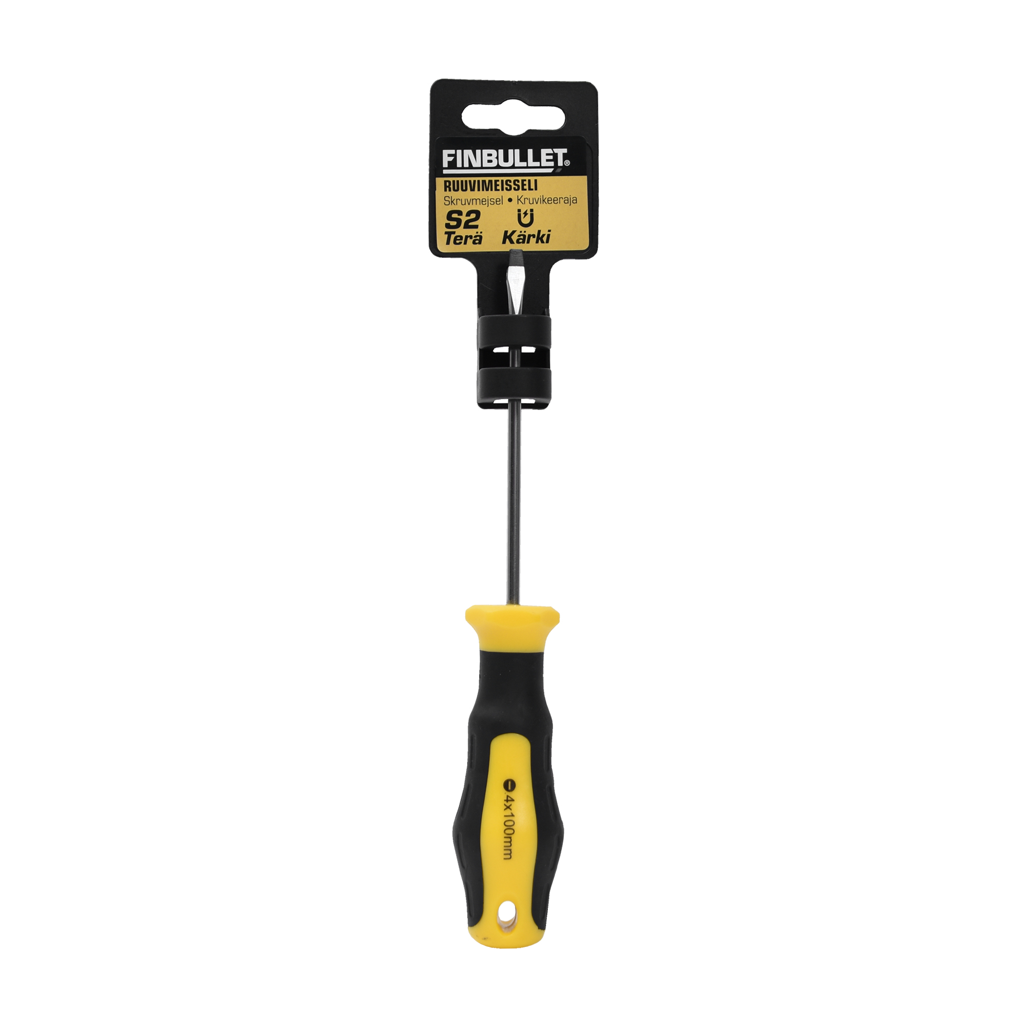 Finbullet ruuvimeisseli SL4 x 100 mm Ruuvimeisseli on satiinikromattu ja siinä on käytännöllinen magneettikärki. Materiaali: S2 teräs Varsi: 100 mm