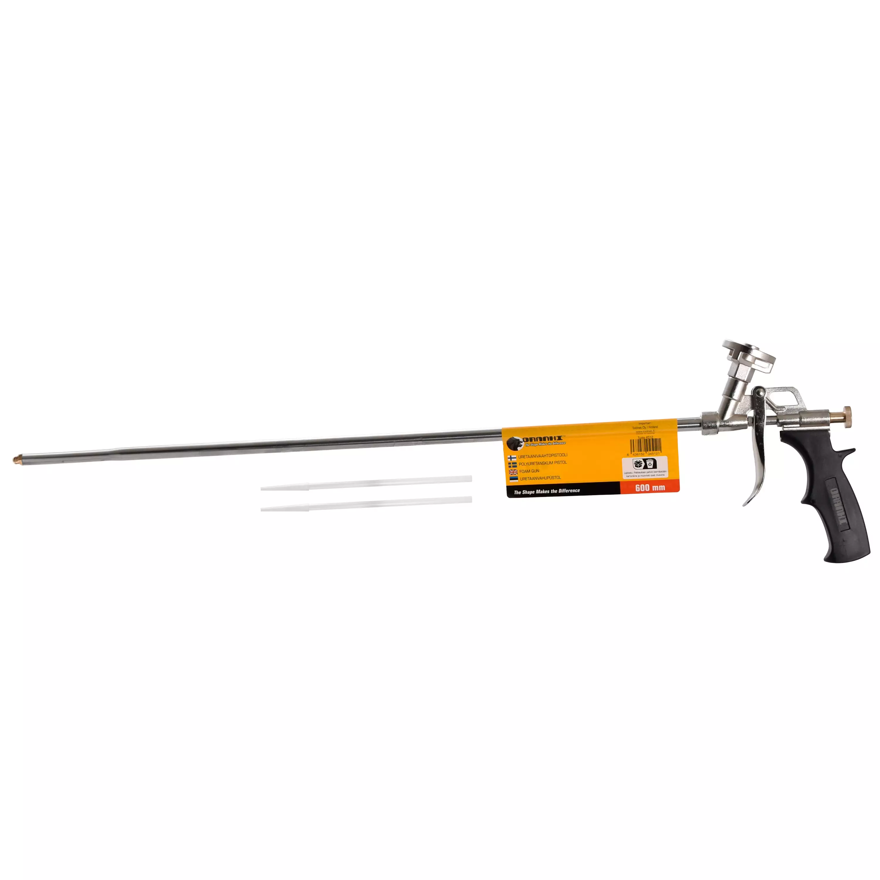 Oranki uretaanipistooli ammattilaisille 60 cm pitkällä piipulla, mahdollistaa vaahdon ruiskuttamisen vaikeapääsyisiin paikkoihin.